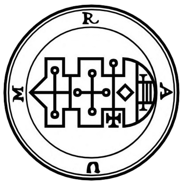 RAUM. - O quadragésimo espírito é Raum. Ele é um Grande Conde; e aparece inicialmente na forma de um corvo, mas após o comando do exorcista ele assume a forma humana. Sua função é roubar tesouros das casas do rei e carregá-los para onde for ordenado, e destruir cidades e dignidades de homens, e contar todas as coisas, o passado e o que é, e o que será; e para causar amor entre amigos e inimigos. Ele era da Ordem dos Tronos. Ele governa 30 Legiões de Espíritos; e seu selo é este, que você usa como mencionado acima.